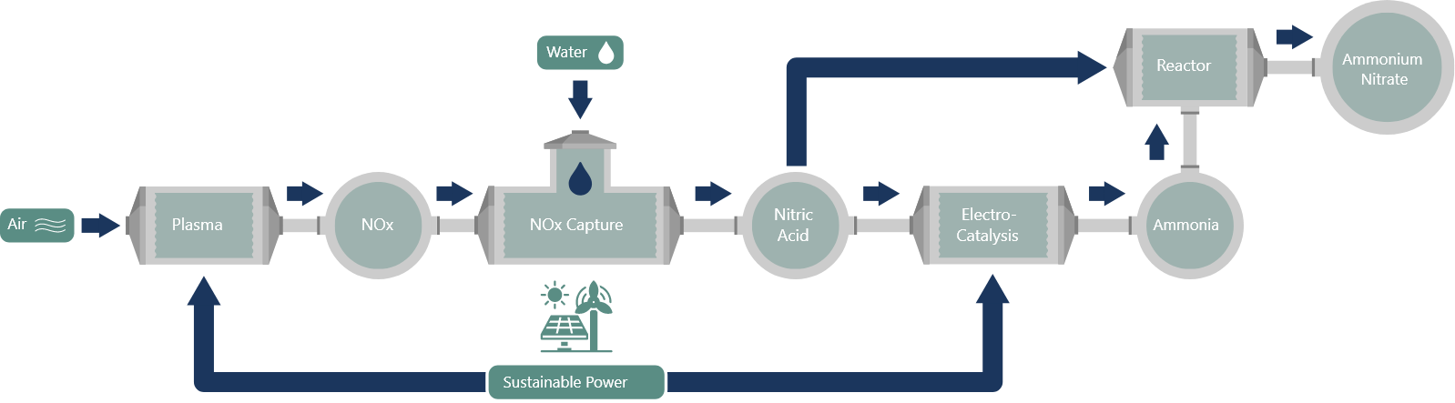 Our plasma nitric acid process simplifies the pathway to ammonium nitrate by reducing ammonia consumption.
